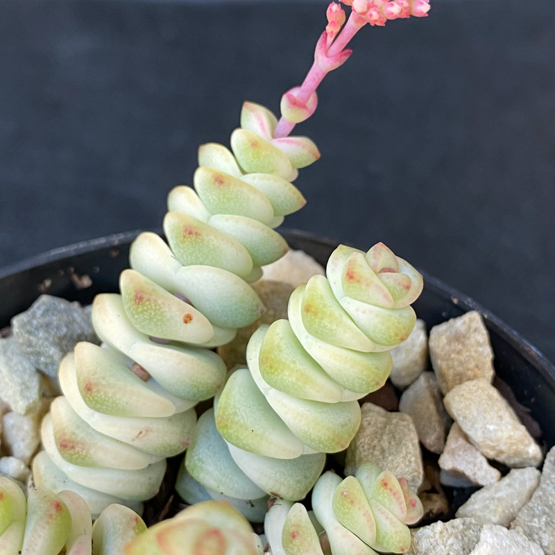 Crassula ‘Fantasy’ is a rare and highly sought-after trailing succulent prized for its captivating miniature form and subtle variegation. This small, slow-growing plant consists of tightly stacked, fleshy, triangular leaves that clasp around thin, woody stems, creating a sculptural, snake-like or caterpillar-like appearance. Its leaves display a soft palette of pale green to blue-green, generously streaked and margined with creamy-yellow variegation. The joints between the leaf layers often blush with delicate reddish-pink tones, especially when grown in bright light, adding warmth to its elegant form. Mature plants send up slender flower stalks in late spring to summer, bearing clusters of small, tubular, pale pink to peachy-pink flowers that emerge from the upper rosettes. It offsets readily, gradually forming an attractive, trailing cluster perfect for hanging baskets, shelves, or as a unique addition to any succulent collection.