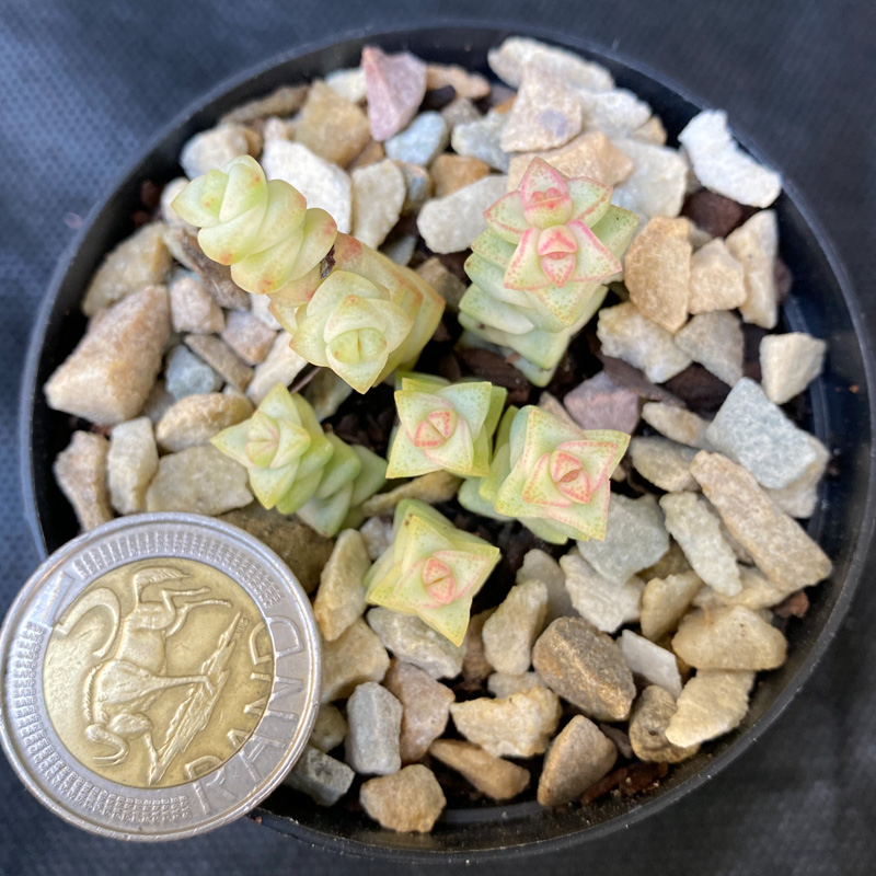 Origin: A cultivated hybrid of Crassula rupestris subsp. marnieriana and Crassula rupestris subsp. rupestris, originating as a variegated mutant of the popular ‘Tom Thumb’ cultivar.