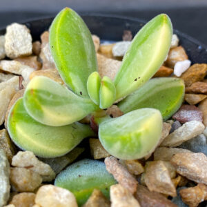 Sedeveria ‘Markus’ variegated is a stunning hybrid prized for its compact rosettes of fleshy, lance-shaped leaves. Each leaf displays a beautiful blend of silvery light green with creamy-yellow variegation along the edges, creating a soft, pastel effect. When happily stressed by bright sunlight, the leaf tips blush with delicate pink or orange-pink tones, adding warmth to its cool palette. This slow-growing succulent forms dense clusters over time, making it a charming addition to fairy gardens, mixed containers, or a prized spot in any collector’s display. In late spring or early summer, it produces delicate clusters of small, star-shaped yellow flowers.